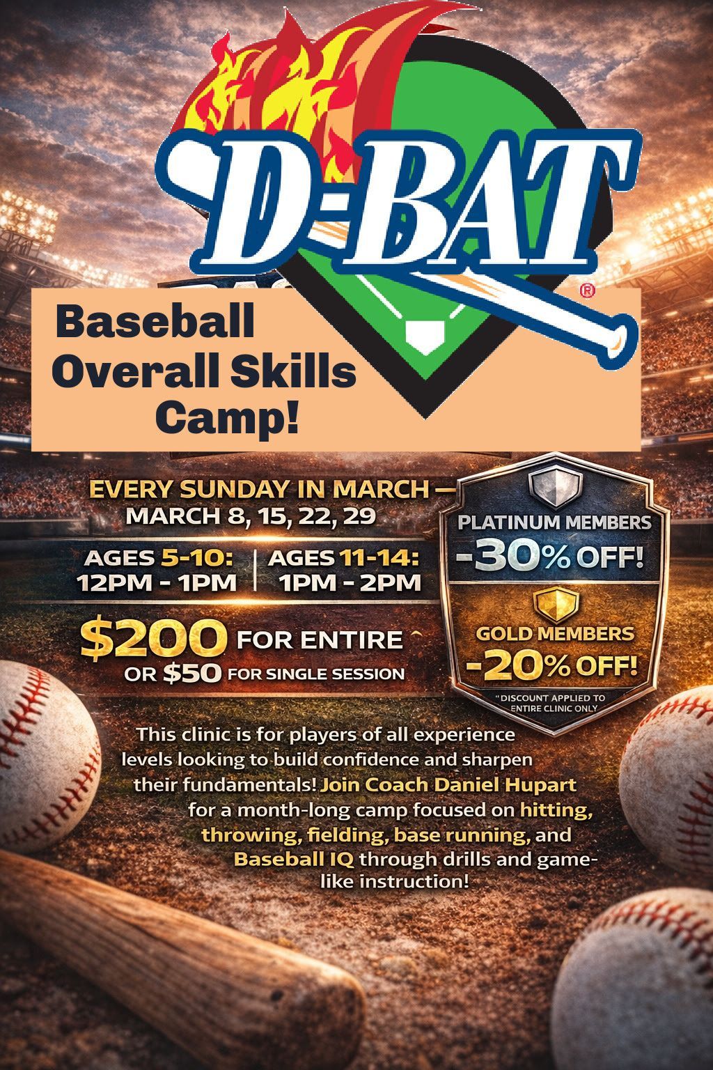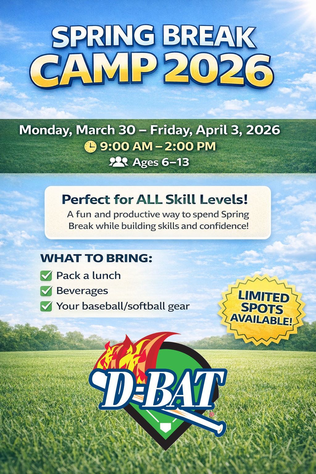 At D-BAT we host more than 50 Camps, Clinics & Classes each year providing a great opportunity for players to improve while having fun at the same time! Our Spring/Holiday Break and Summer Camps are very popular with parents who are looking for something constructive to keep their ballplayers busy when school is out. Our specialty clinics — typically focused on one aspect of the game — give athletes a chance to fine-tune established skills or work on problem areas. For the latest information on our camps and clinics see our camp fliers below.